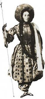In 1838 Henriette d’Angeville, "La Fiancée du Mont Blanc”, was the first woman who climbed Mont Blanc herself unaided (before her in 1808 Maria Paradiso had been carried by her guides most of the way to the peak). At the beginning of XIX century there was no mountaineering clothing for women. Henriette had to climb in clothes that weighted nearly ten kilos! For the first part of the journey she wore a dress of brown merino and white trousers, with a little hat of light straw and a gauze veil. Then she wore red flannel underwear, woolen stockings on top of silk stockings, tweed, flannel-lined knickerbockers, a fur hat, a straw hat, a velvet mask, a veil, a fur-lined pelisse and green spectacles.